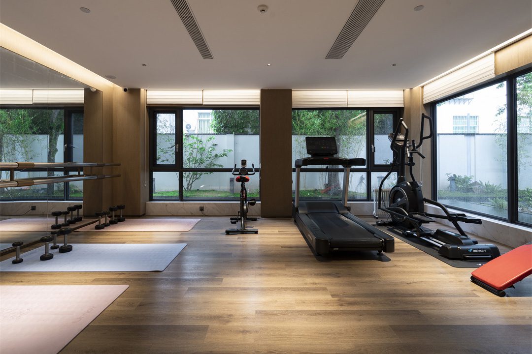 酒店的健身房地板採用了高品質的深色木質地板,為整個運動空間增添了穩重和現代的氛圍。地板的選擇不僅提升了房間的整體美感,還具備優越的耐用性和防滑性,能夠承受各種健身器材的重量和日常運動的磨損,確保安全性和舒適度。