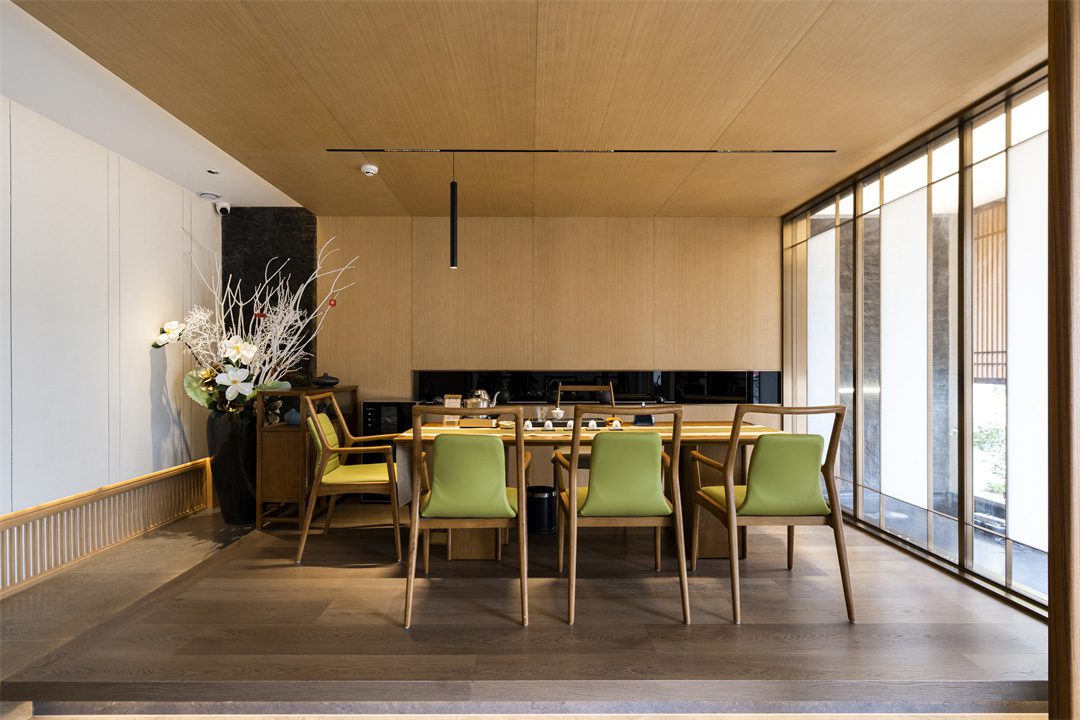 品茶間地板裝潢採用了深色木質地板,展現出溫暖而典雅的氛圍。地板的深色調與木質家具的自然紋理相互呼應,營造出一種和諧統一的感覺,適合營造安靜、沉穩的室內空間。這種木質地板不僅美觀大方,還具備耐用和易於清潔的特點,非常適合公共空間和高度使用的區域,如餐廳和休息室。地板設計凸顯了旅店高品質的裝修風格,為住客提供了一個舒適且富有格調的居住環境。