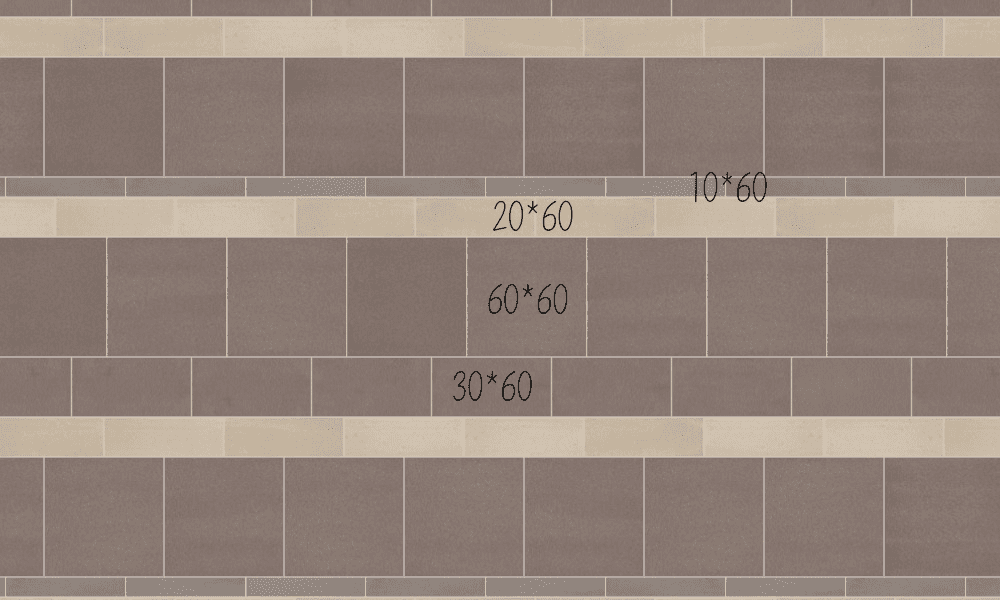 舉例來說,一塊60*60的磁磚可做到的不只是平貼,它可以透過錯拼再被切割成三塊,如30*60一塊、20*60一塊、10*60一塊,由大至小,寬度不變,可以改變順序,形成不規則的樣式,如下所示: